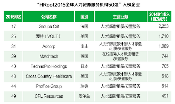在“HRoot2015全球人力資源服務機構50強”榜單中,有8家企業首次入榜,同時去年入榜的8家企業出榜。其中,在出榜企業中,“HRoot2014全球人力資源服務機構50強”入榜企業CHANDLER MACLEOD因退市而出榜,前程無憂(51job)、hydrogen、DHI Group、HRnet Group、Clarius Group因營收未達标遺憾出榜。