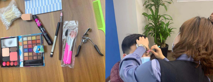 課程實踐環節,小組分發化妝小套裝,并且由老師給模特現場修眉教學,對在場對于化妝手法較為生澀的男士學員進行化妝基本指導。