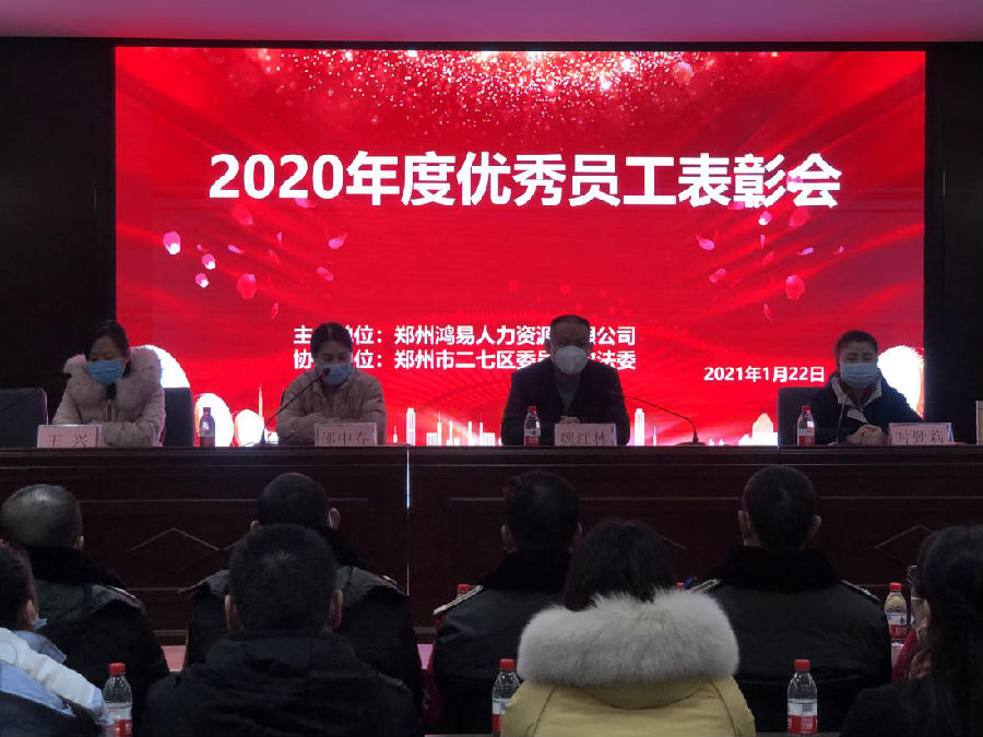 時光飛逝,歲月如梭,忙忙碌碌間,我們走過充滿感動和堅強的2020年,迎來充滿希望的2021年。新的一年,孕育新的期望, 2021年1月22日下午,由鄭州鴻易公司主辦,鄭州市二七區委政法委協辦的2020年度優秀員工表彰會在二七區京廣路辦事處會議室召開。鄭州市二七區人社局人力資源服務中心邵中春主任、二七區委政法委魏紅林書記、王興主任、鄭州鴻易時勤莉董事長及優秀員工,員工代表共59人參加了本次表彰會。